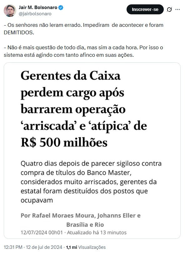 A postagem mencionada por Vorcaro, feita por Bolsonaro, fazia referência a uma reportagem do jornal O Globo que relatava a demissão de gerentes da Caixa Econômica Federal após eles barrarem uma operação de aproximadamente R$ 500 milhões envolvendo compra de títulos ligados ao Banco Master. Segundo a matéria, a transação foi classificada internamente como atípica e arriscada.