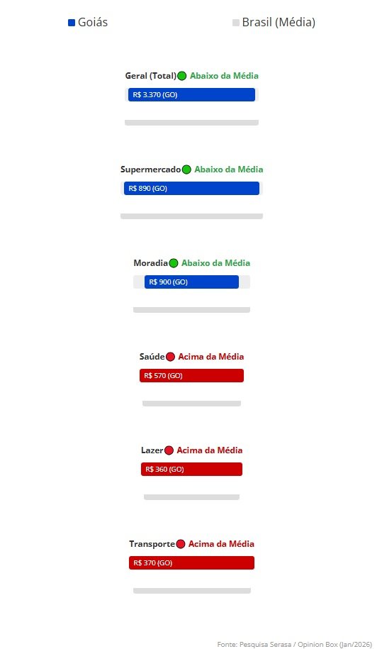 Goiás supera a média brasileira em setores vitais para o cidadão. Na categoria de saúde e atividade física, enquanto o brasileiro gasta em média R$ 540, os goianos desembolsam R$ 570 mensais. No setor de transporte e mobilidade, o estado ocupa a 5ª posição no ranking nacional com gasto médio de R$ 410, valor superior aos R$ 350 da média nacional devido a questões de infraestrutura e deslocamento.