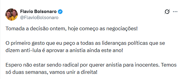 – Tomada a decisão ontem, hoje começo as negociações! O primeiro gesto que eu peço a todas as lideranças políticas que se dizem anti-lula é aprovar a anistia ainda este ano! – escreveu.