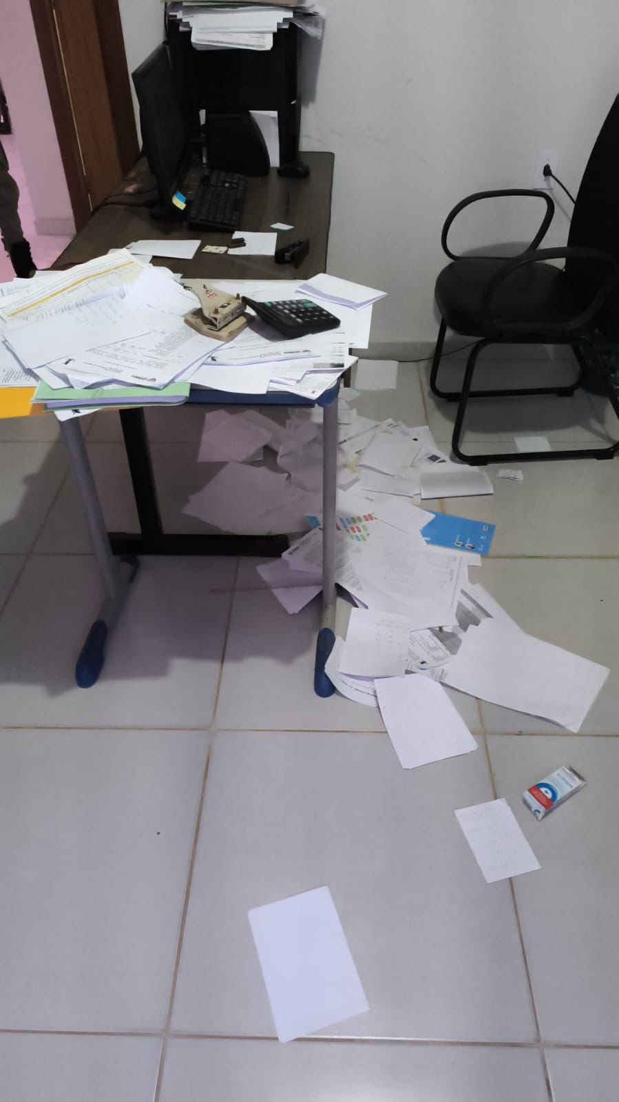 No local, a guarnição manteve contato com o comunicante e vítima, o qual relatou que, ao iniciar o expediente na garagem municipal, constatou que as salas da seção administrativa apresentavam sinais de violação, com gavetas e documentos revirados.