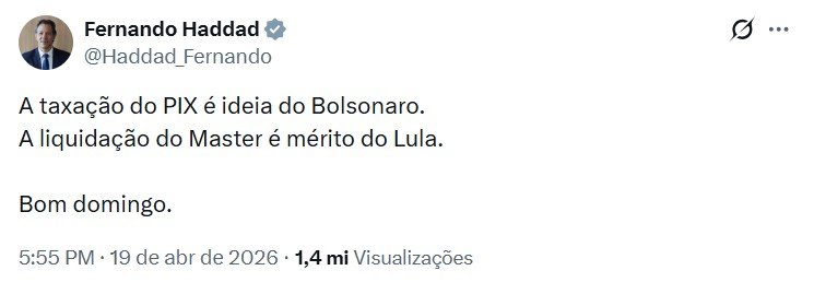 – A taxação do PIX é ideia do Bolsonaro. A liquidação do Master é mérito do Lula – escreveu Haddad em uma breve postagem no X.