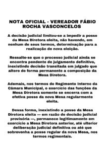 O presidente interino da Câmara Municipal de Uruaçu, Fábio Rocha Vasconcelos, enviou uma nota à imprensa elucidando pormenores acerca da situação legal referente à eleição da mesa diretora da Câmara, a qual foi realizada em agosto passado e posteriormente suspensa pela Justiça de Uruaçu.
