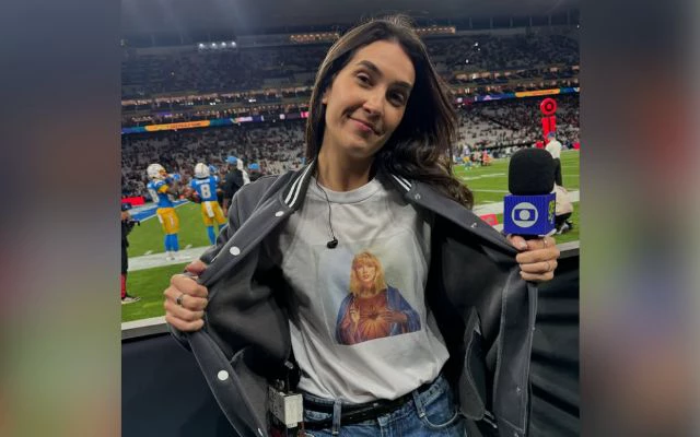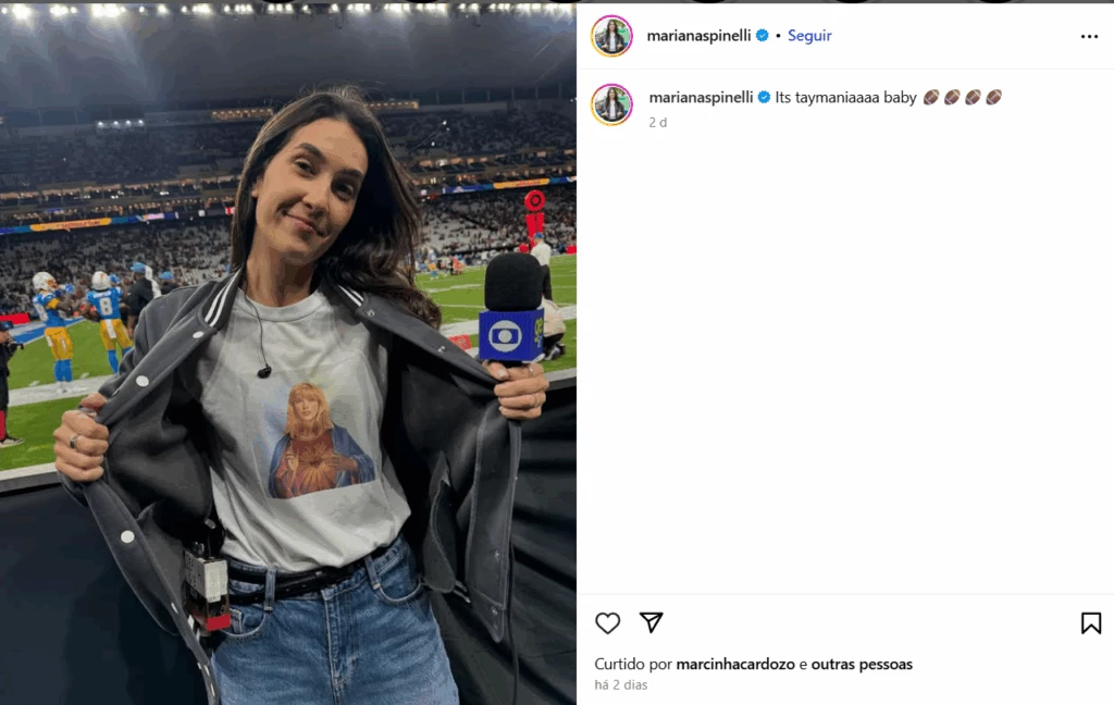 A jornalista Mariana Spinelli, do Globo Esporte, foi criticada nesta sexta-feira (5) após aparecer em uma postagem usando uma camiseta com a imagem de Nossa Senhora, mas com o rosto da cantora Taylor Swift. O episódio ocorreu durante a abertura da NFL no Brasil, em São Paulo.